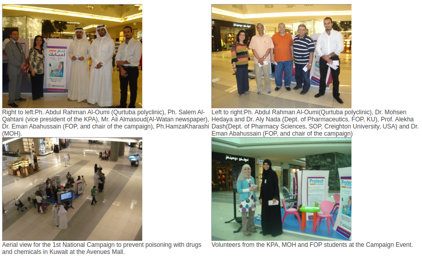 Faculty of Pharmacy- Kuwait University in collaboration with Kuwait Pharmaceutical Association and with the Ministry of Health launched the 1st National Campaign to prevent poisoning with drugs and chemicals in Kuwait at the “Avenues Mall” during a two days event 24th and 25th May 2012. The objectives of the Campaign were to provide awareness to the public about unintentional poisoning among children in Kuwait and provide education on how to react in case of poisoning and how to prevent it. Over 800 families have been educated about the subject.